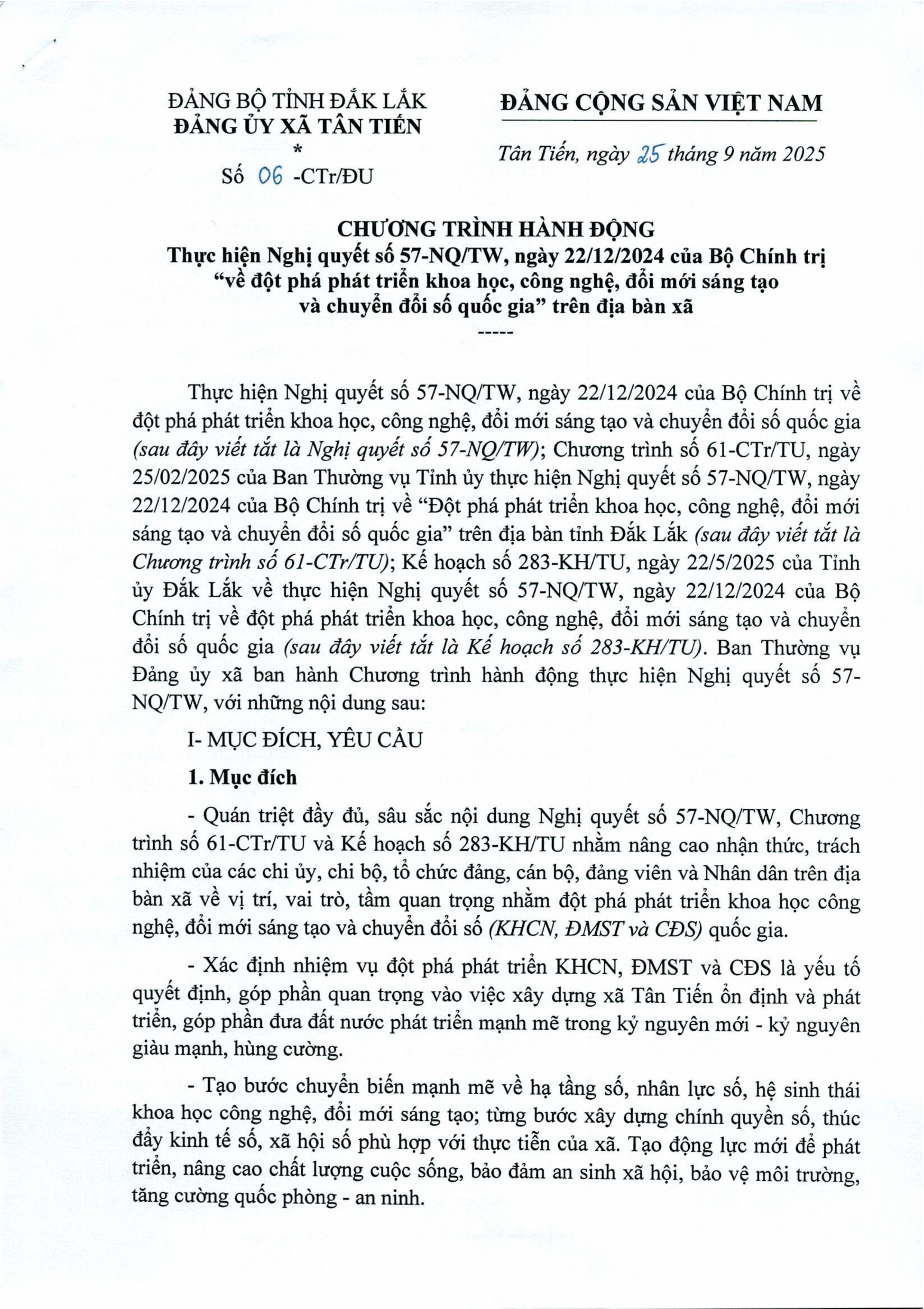 - CHƯƠNG TRÌNH HÀNH ĐỘNG Thực hiện Nghị quyết số 57-NQ/TW, ngày 22/12/2024 của Bộ Chính trị “về đột phá phát triển khoa học, công nghệ, đổi mới sáng tạo và chuyển đổi số quốc gia” trên địa bàn xã