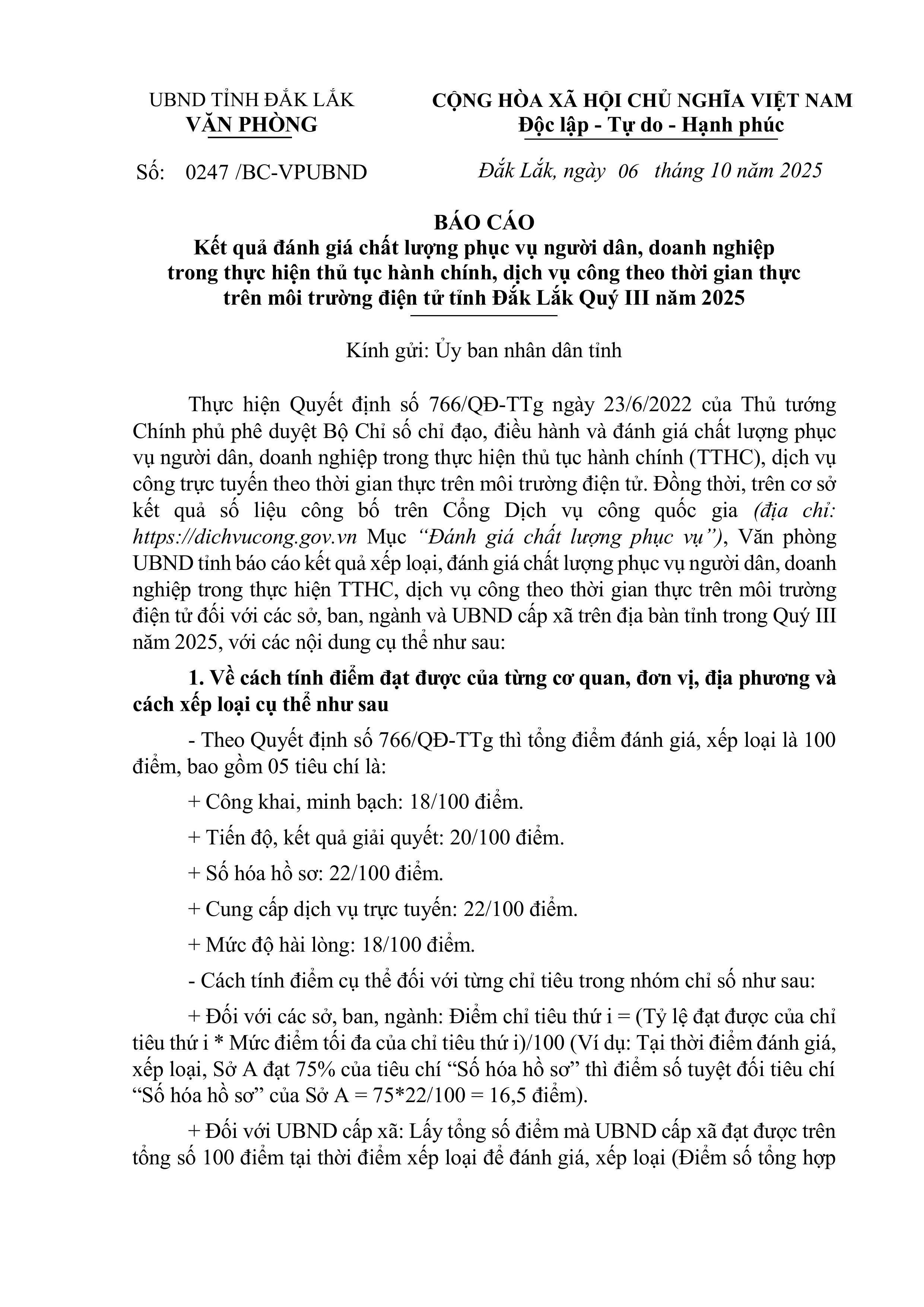 - KẾT QUẢ ĐÁNH GIÁ CHẤT LƯỢNG PHỤC VỤ NGƯỜI DÂN, DOANH NGHIỆP TRONG THỰC HIỆN THỦ TỤC HÀNH CHÍNH, DỊCH VỤ CÔNG THEO THỜI GIAN THỰC TRÊN MÔI TRƯỜNG ĐIỆN TỬ TỈNH ĐẮK LẮK QUÝ III NĂM 2025