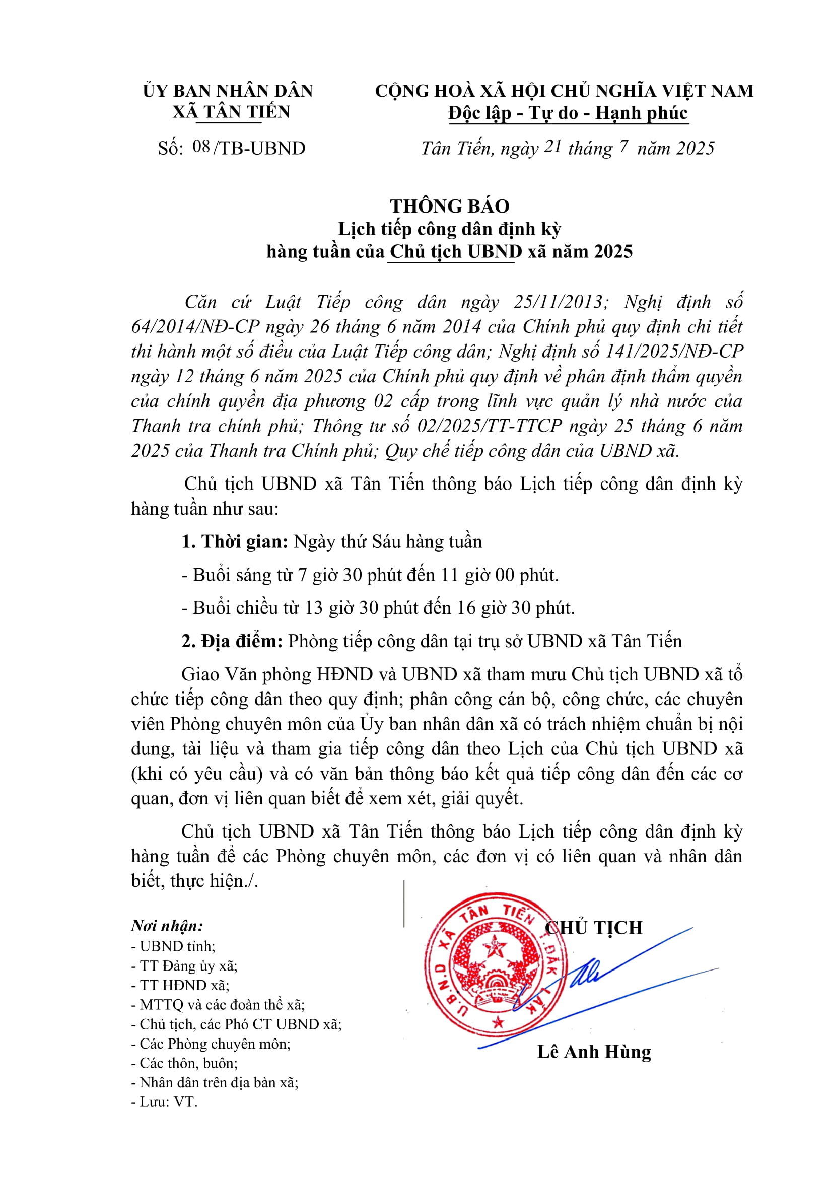 - LỊCH TIẾP CÔNG DÂN ĐỊNH KỲ HÀNG TUẦN CỦA CHỦ TỊCH UBND XÃ NĂM 2025